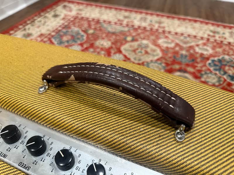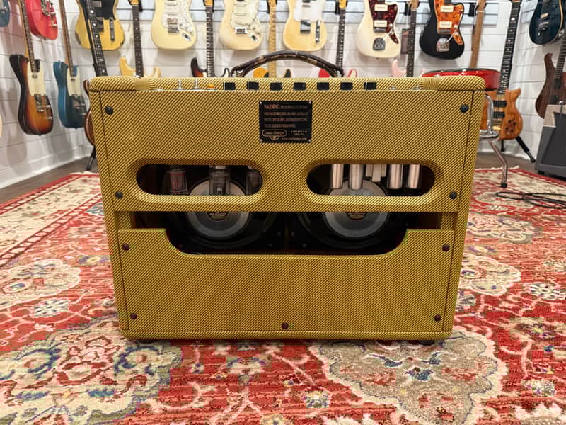 The V-front cabinet features ambered lacquered diagonal tweed and oxblood/gold stripe grillcloth, topped off with a premium leather handle. This amp is remarkably clean with just a scant few marks on the enclosure edges, and the faceplate has pristine graphics and brown barrel knobs